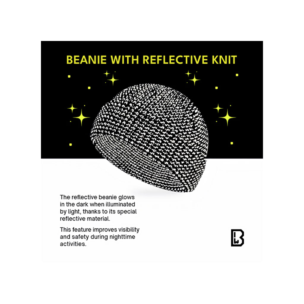 Reflekterende strikket lue med elastisk passform for maksimal komfort. Laget av 100 % polyakryl, et mykt og varmt materiale med et koselig fleecefôr som holder deg varm selv i kaldt vær. Har oppbrettet kant og en diskret logoetikett for et stilrent og enkelt utseende. Integrert reflekterende garn øker synligheten i mørket, noe som gjør lua både praktisk og trygg for utendørsbruk.